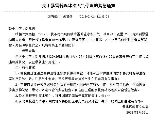 接新北区教育局紧急通知,根据气象预报,24-28日我市将出现持续降雪低温冰冻天气,为保障学生安全,1月25-26日停课两天,27、28日正常双休,29日正常开展教学工作(如遇特殊情况,以区最新通知为准)。