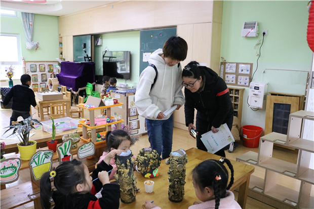 我园谢菊仙园长、王娟副园长热情接待了幼教同仁。为了更加真实的展现我园的一日生活,到访的同行们根据各自需求走进班级,观摩幼儿区域游戏,与班级老师对话,了解班级区域的创设及当下活动的开展并倾听了幼儿游戏后的分享交流。