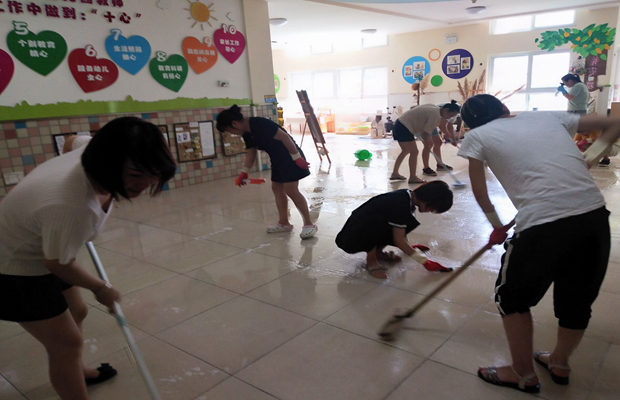 由于天气炎热,工作量较大,后勤老师们齐心合力,分工合作,一部分人扫地、一部分人擦窗、一部分人冲洗……经过一天的“奋战”,大家帮幼儿园彻底“洗了个澡”,让幼儿园焕然一新,呈现出整洁清新的新气象。