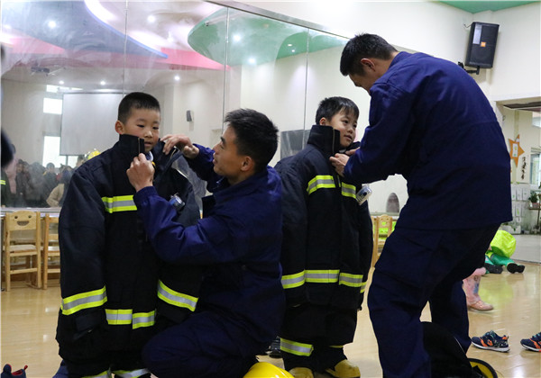 孩子们一个个围在消防员叔叔身边,认真倾听消防员叔叔介绍消防员出警时的战服——消防服,现场演示如何穿消防服,并邀请幼儿、教师试穿,把本次活动推上了高潮,孩子们在消防员叔叔的帮助下穿上了装备,有个小朋友说:“穿上了消防服,我感觉我就是消防员。”老师穿上消防服,第一感觉就是“太重了,”也更深切的感受到了消防员的辛苦。